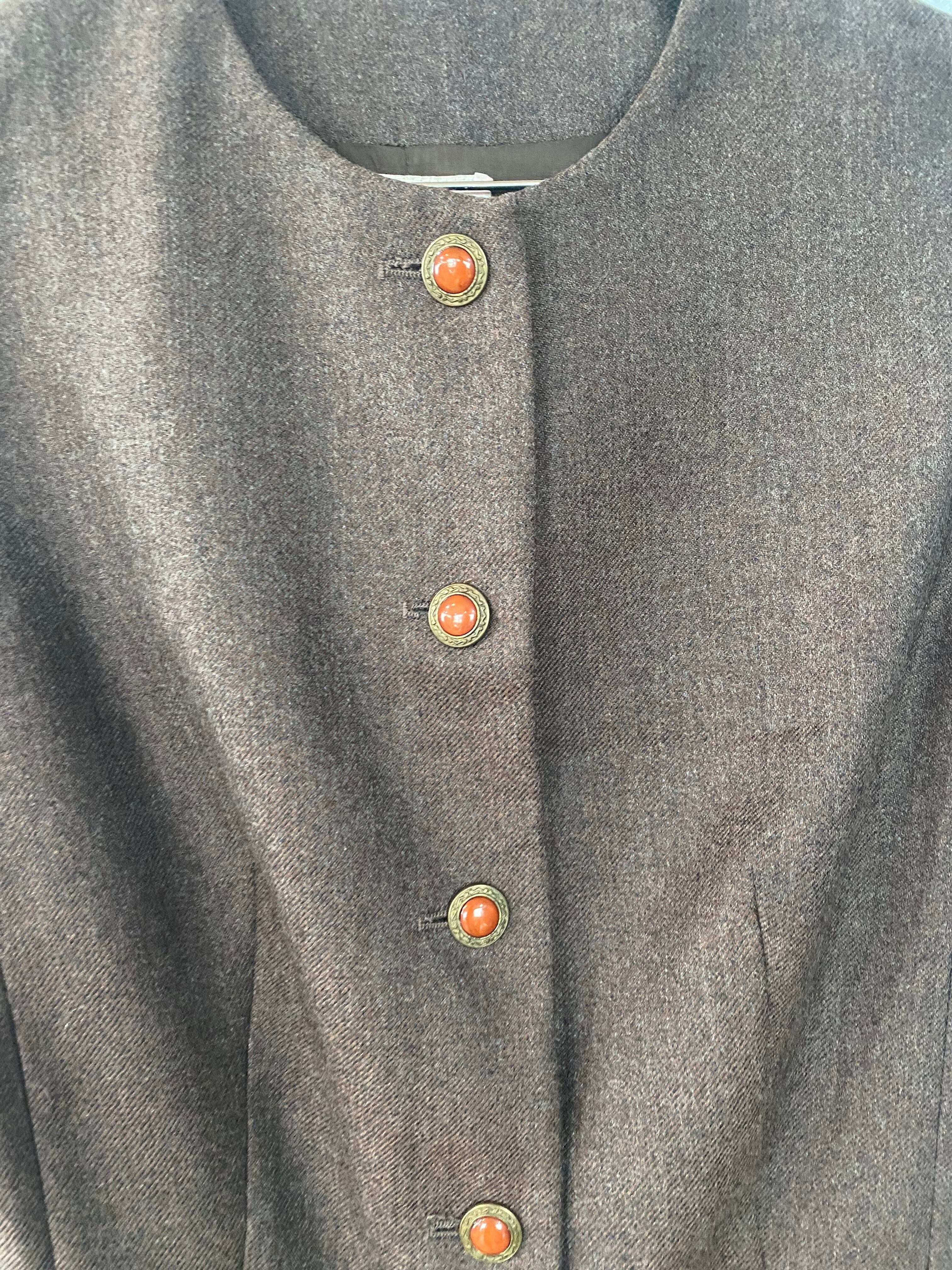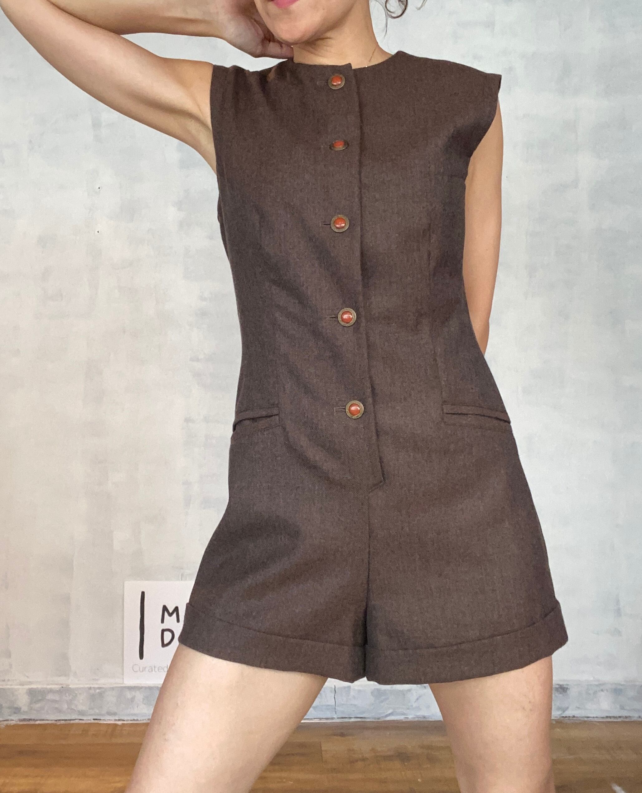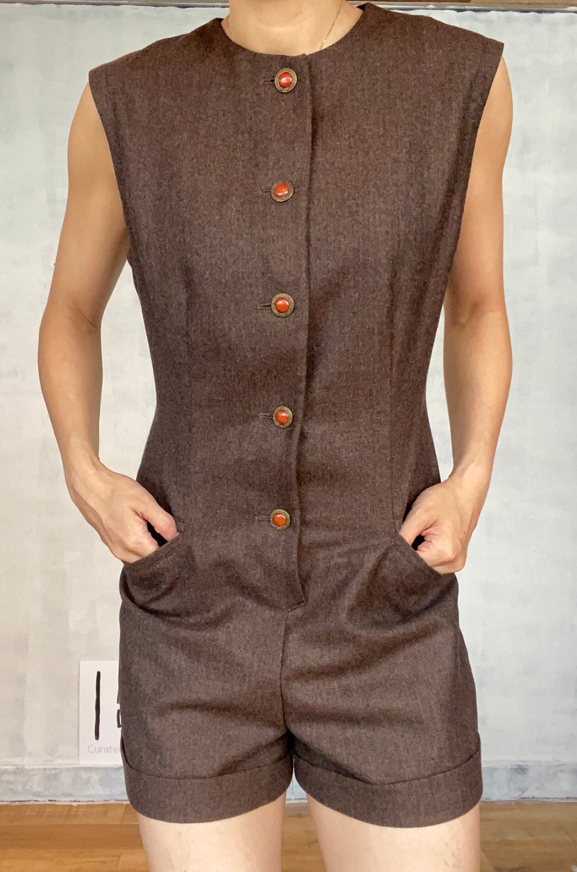 ブラウン、ウール、コンビネゾン、アンティーク釦。